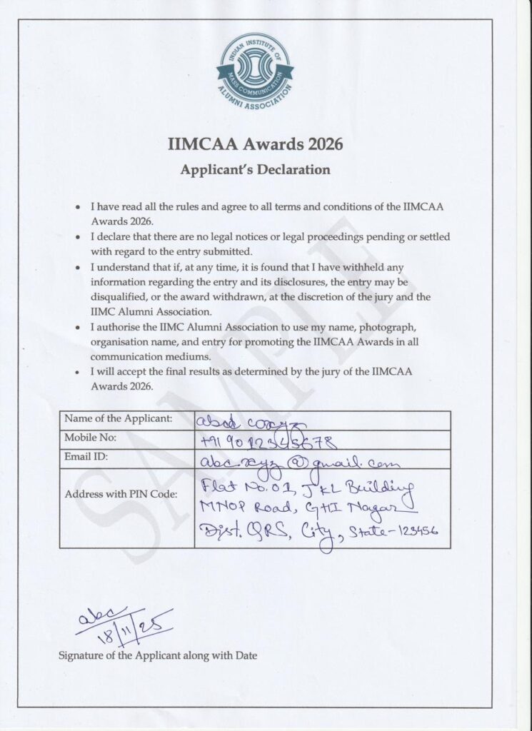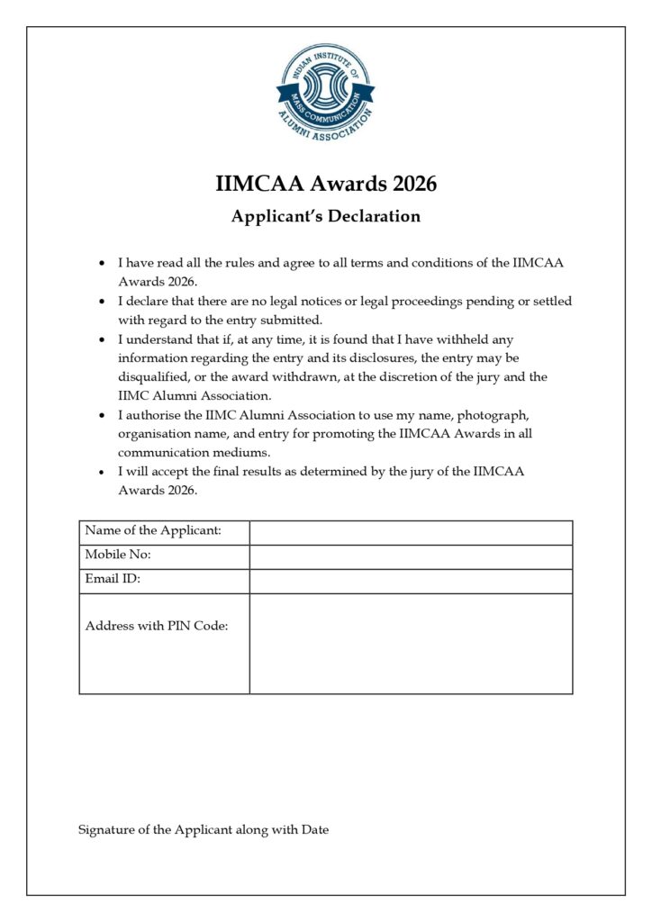 12. The names of the organization of the winners, their designations, or their freelance status will be acknowledged on certificates and trophies for the IIMCAA Awards 2026.