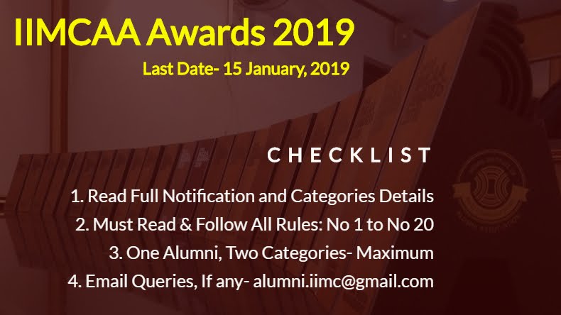 3. Entries to be sent at alumni.iimc@gmail.com clearly mentioning applicants NAME and CATEGORY in SUBJECT line.