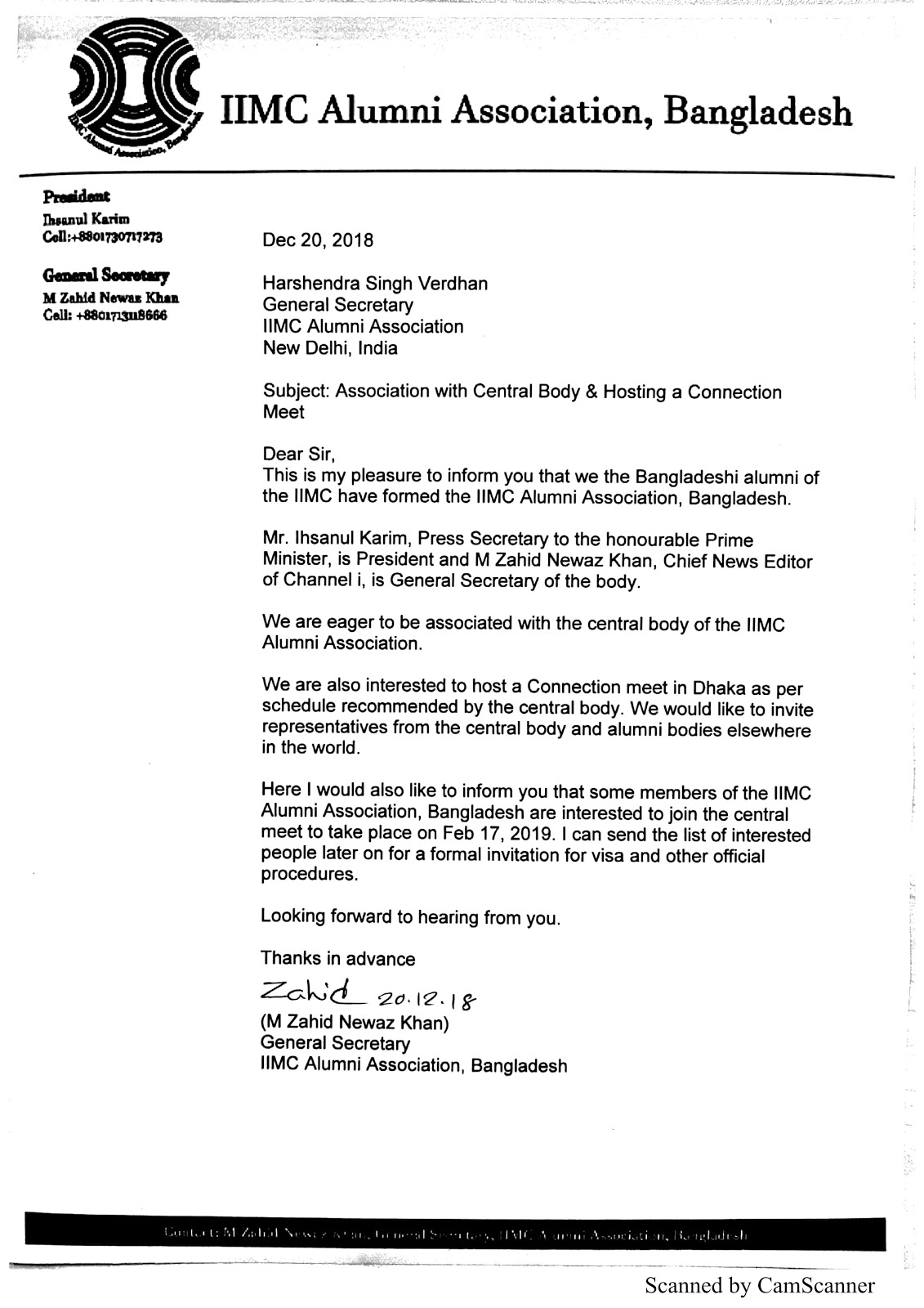 IIMC Alumni Association, Bangladesh has become a part of IIMCAA Global Network of Chapters/ Sub Chapters. IIMC Alumni Association, Bangladesh, formed on May 20, 2018 in Dhaka, is being headed by Mr. Ihshanul Karim, Press Secretary to the Hon. PM of Bangladesh. Mr. M Zahid Newaz Khas, Channel i Chief News Editor, had been elected General Secretary at 20th May meeting. IIMCAA, Bangladesh office bearers are as follows.