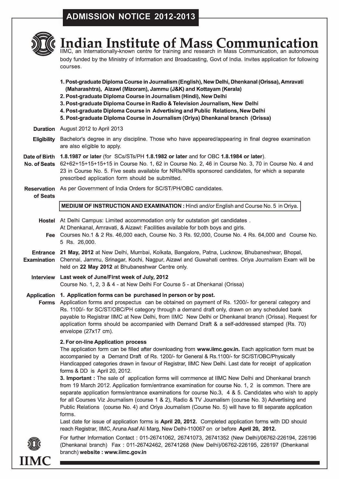 Last date for issue of application forms is April 20, 2012. Completed application forms with DD should reach Registrar, IIMC, Aruna Asaf Ali Marg, New Delhi-110067 on or before April 20, 2012.