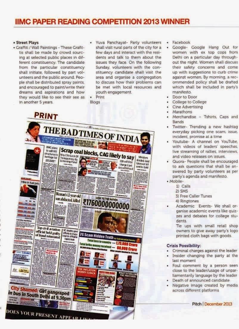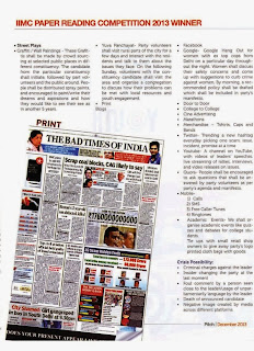 IIMC Paper Reading Competition 2013 | Campaign | Winner in PITCH Leave a Comment / Alumni Meet, Annual Alumni Meet, Connections, IIMC, IIMC Alumni Association, IIMC Connections, IIMCAA, IIMCAA Awards, Indian Institute of Mass Communication / By IIMC Alumni Association / January 5, 2014 IIMC Paper Reading Competition 2013 | Campaign Category Winning Paper in PITCH, The Print Partner of the Competition. http://feeds.feedburner.com/ IimcAlumniAssociation