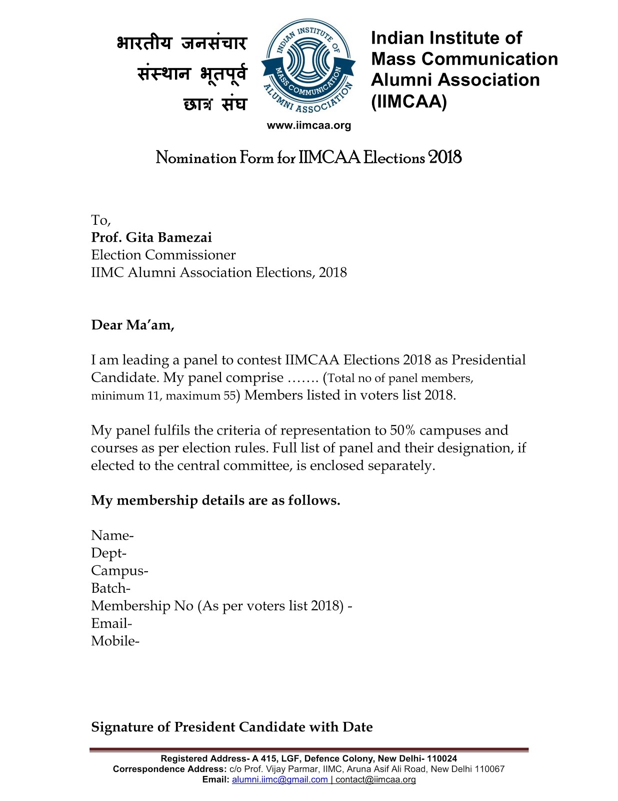 Nominations for Biennial Election for the Central Committee of IIMC Alumni Association is open until September 16, 2018. Any panel willing to contest IIMCAA Elections shall submit nomination papers duly signed by Presidential candidate and a separate letter of proposers backing them.