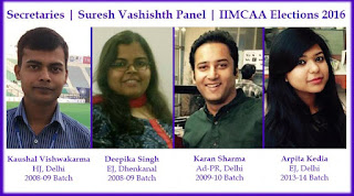 Mr. Kaushal Vishwakarma of HJ, Delhi (2008-09), Ms. Deepika Singh of EJ, Dhenkanal (2009-10), Mr. Karan Sharma of Ad-PR, Delhi (2009-10) and Ms. Arpita Kedia of EJ, Delhi (2013-14) are Secretary Nominees in official panel led by Mr. Suresh Kumar Vashishth for IIMCAA Elections, 2016.
